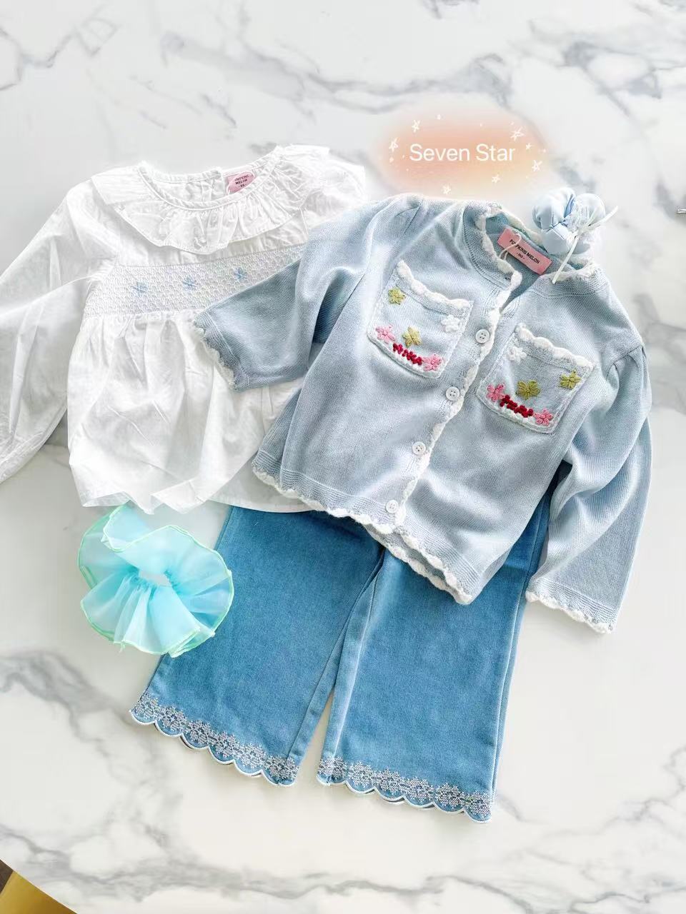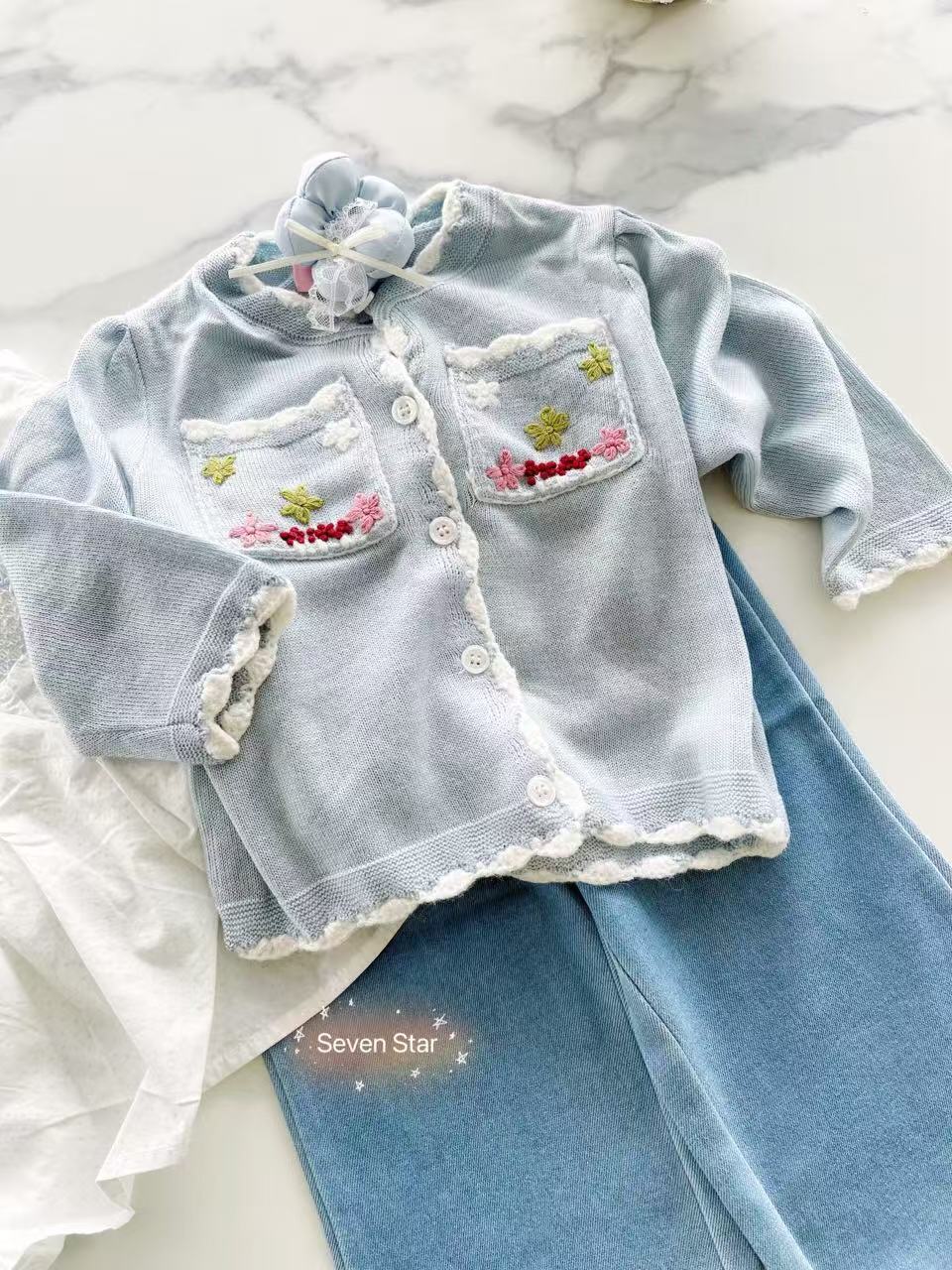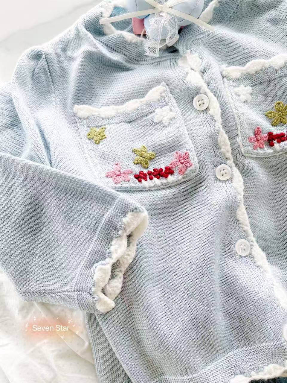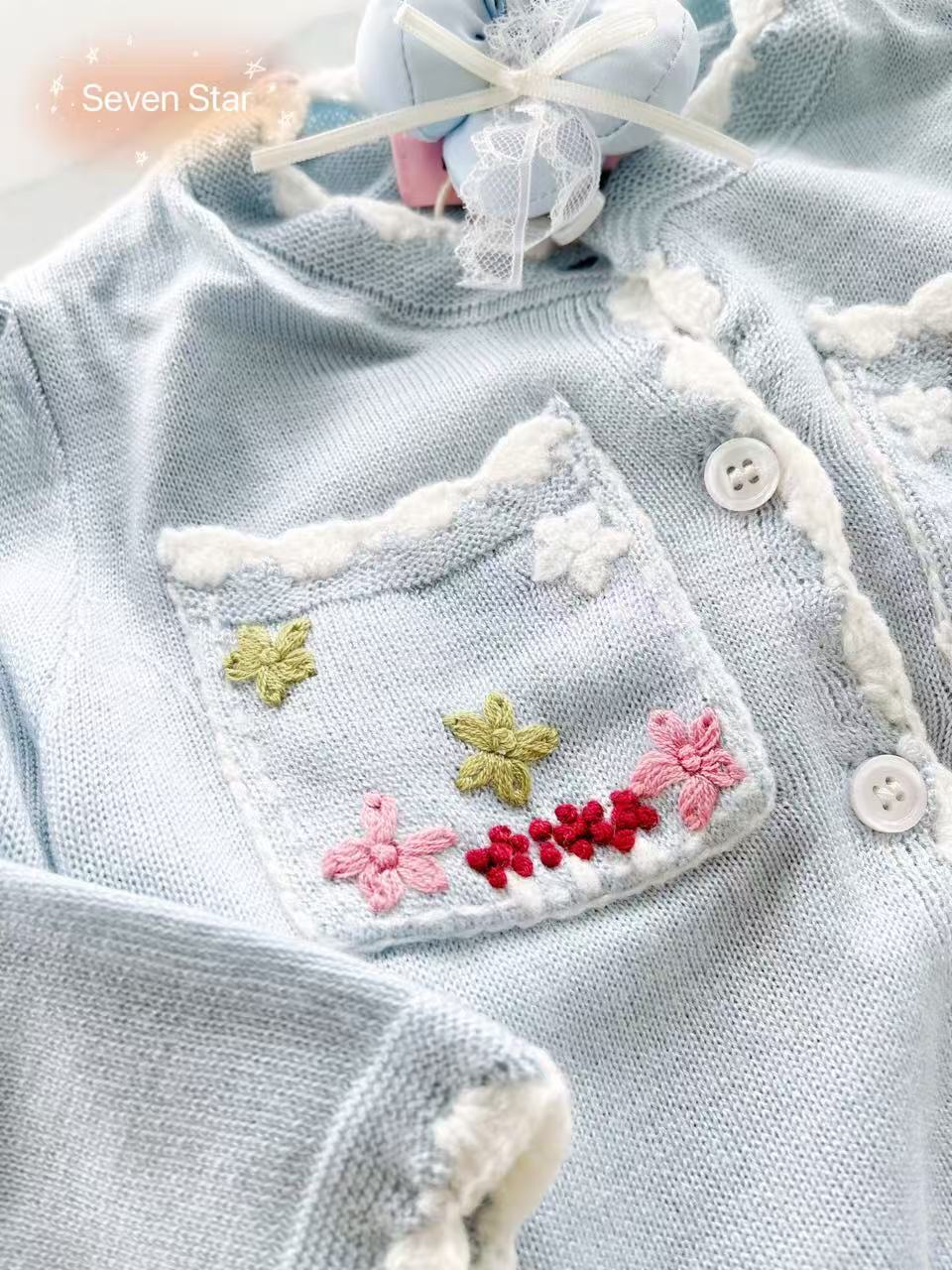 Blue Cardigan Embroidered Flower Long Sleeve Sweater